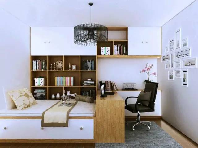 对于每个人来说,家里如果没有几本藏书,这是不科学的。根据房型的布局,休息与办公区域也得到了很好的规划。颜色以胡桃色与白色拼接,稳重之间透露着活泼,使得整个房间柔和,轻松。