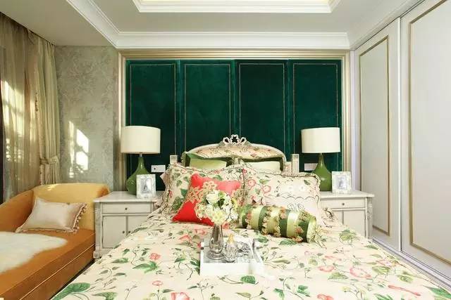 整面绿色背景墙,类似中式屏风的设计,翠绿色碎花床,绿色床头灯,都显得十分精致活泼