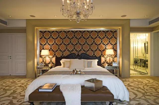 豪华金色主卧,靠枕和背景墙色调一致,都在衬托白色卧室床