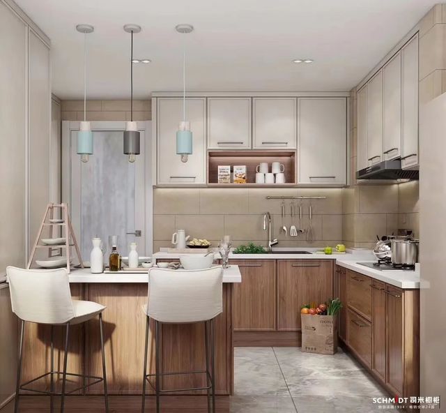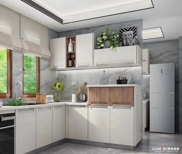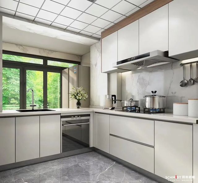 纯白的空间总能带来通透明净的清爽感,要是把L型厨房布置成白色系,看着就不会有压抑感,反而显得更亮堂、空间也更开阔。