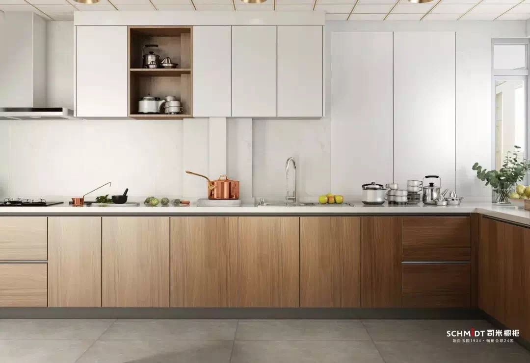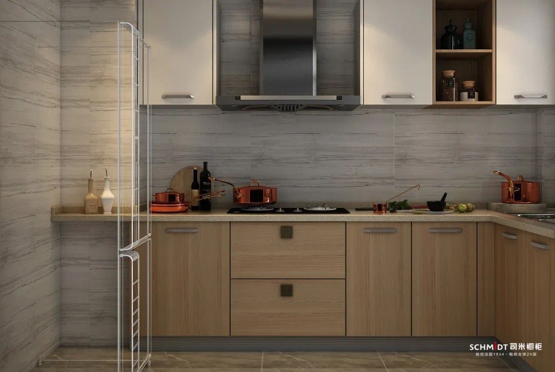 原木色调带着自然的质感,颜色柔和清新。把它用在厨房空间里,每个角落都透着优雅的氛围。